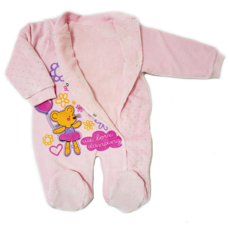 Комбинезон без капюшона, с закрытыми ножками, рукава на манжете, спереди на кнопочках от воротничка до конца ножки. Украшен спереди рисунком персонажей из мультиков.