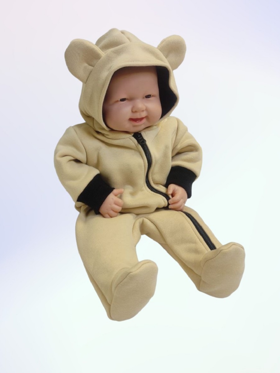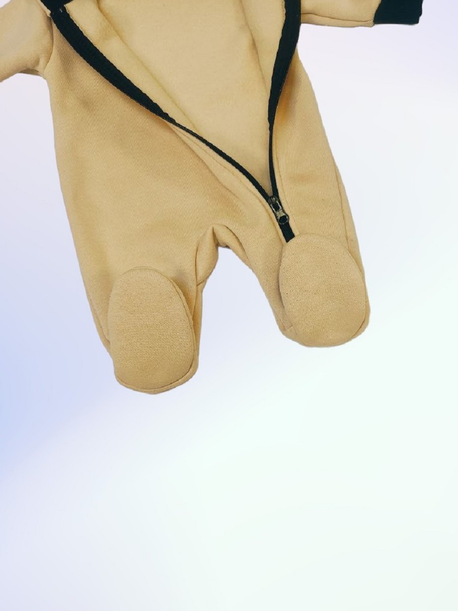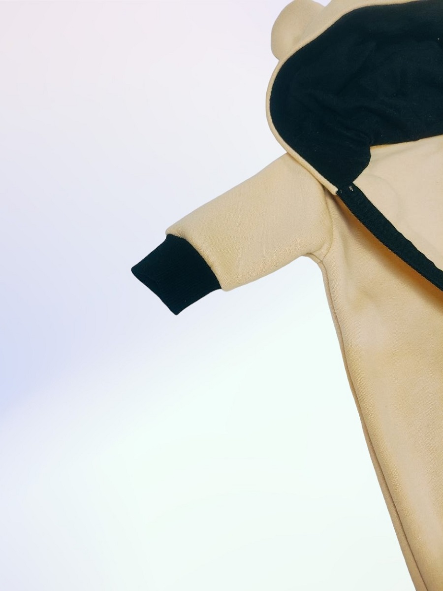 Комбинезон выполнен из футера двухнитки с начёсом. Спереди косая молния, капюшон на подкладке. У комбинезона закрытые ножки, на рукавах манжеты.